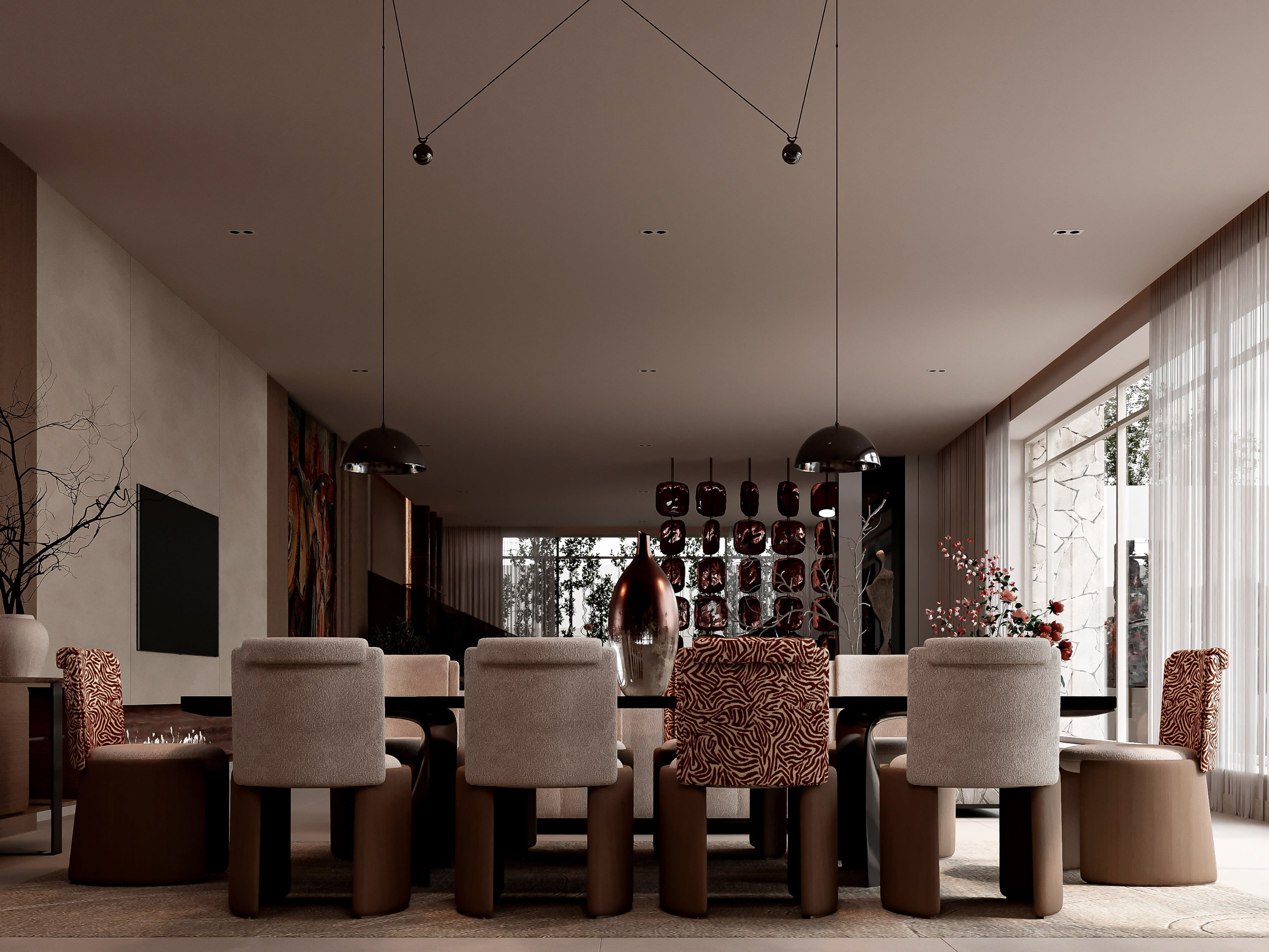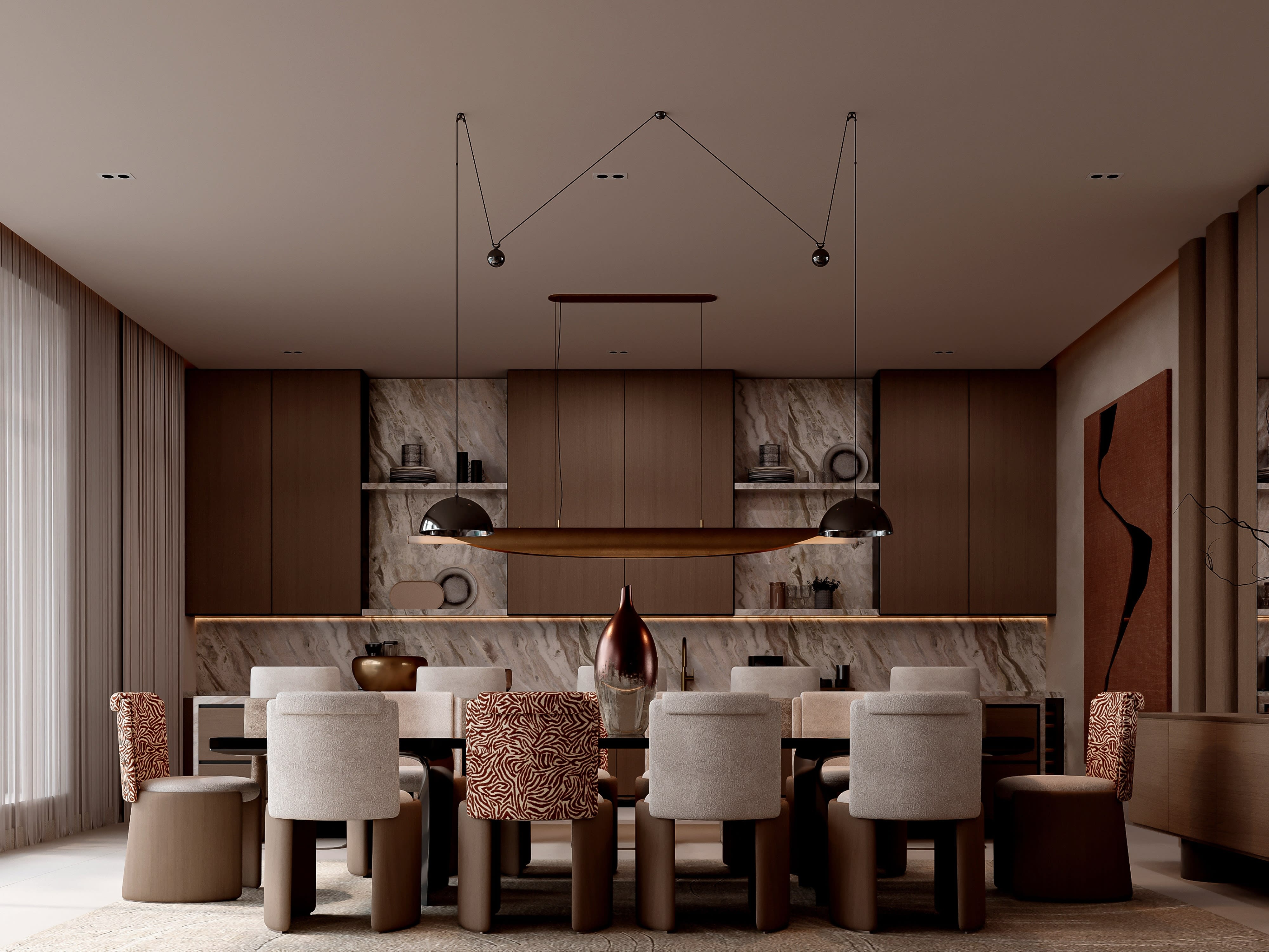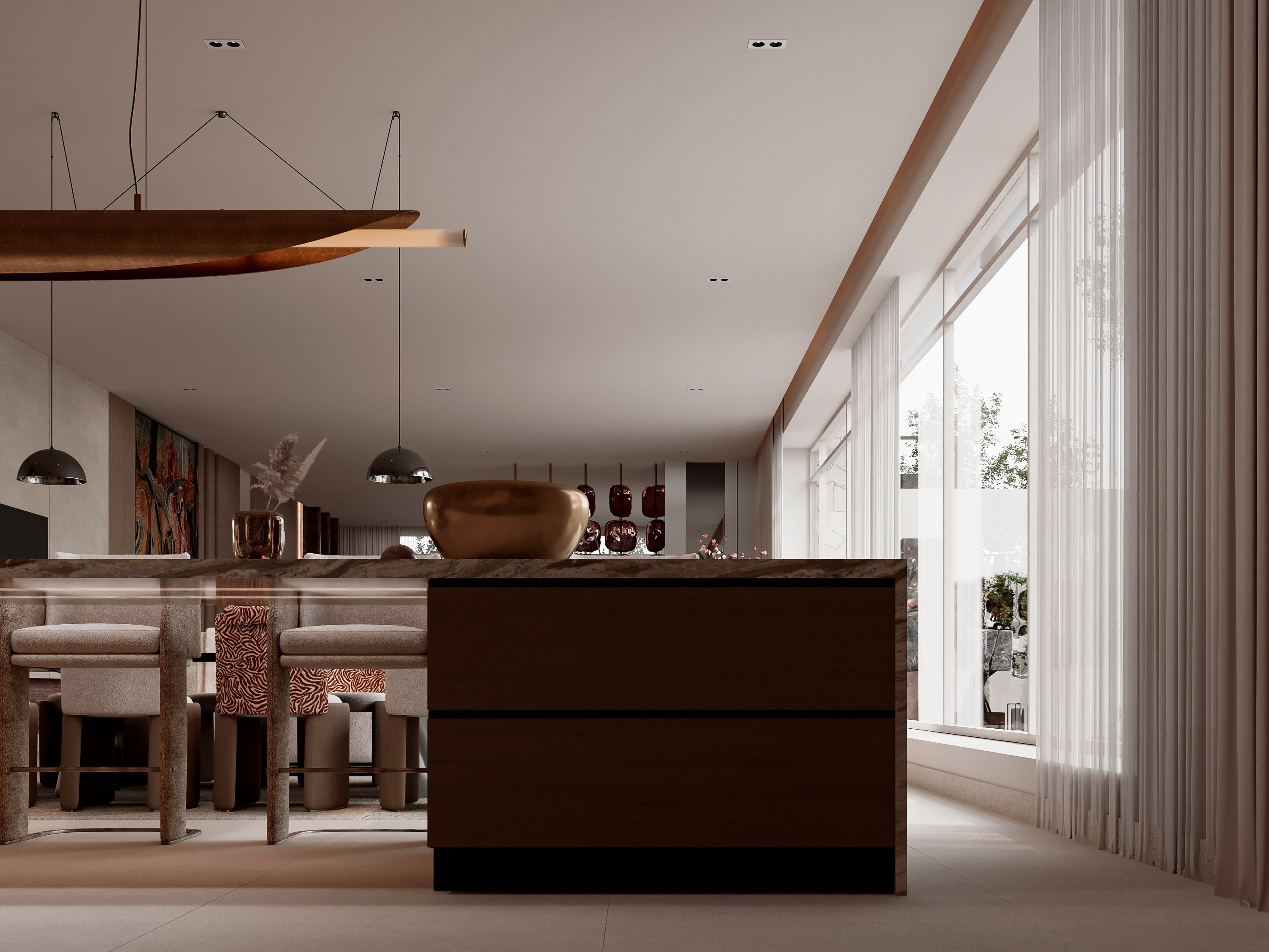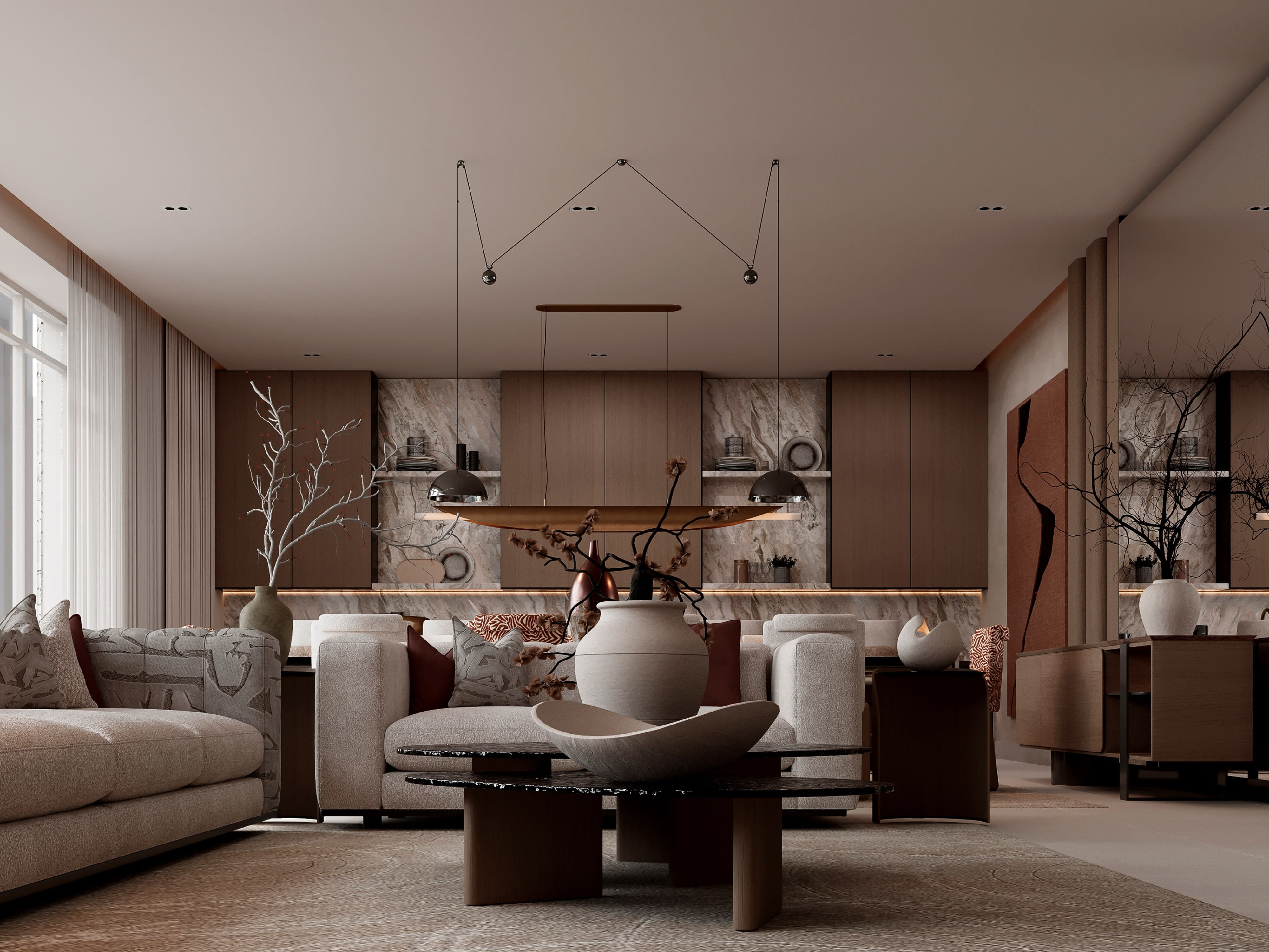 Natural light was a primary driver of our design decisions for Contemporary Sanctuary. The apartment's floor-to-ceiling windows provide abundant daylight, but we needed to manage this light carefully—maximizing illumination while controlling glare and heat gain. We specified automated sheer curtains that can be adjusted throughout the day, filtering harsh midday sun while maintaining views and sense of connection to the outside. For privacy at night, blackout curtains conceal behind a soffit detail, completely hidden when not in use. But natural light is only part of the story; artificial lighting design was equally crucial to creating the right atmosphere for different times and activities. We developed a comprehensive lighting scheme with multiple layers: ambient lighting from recessed ceiling fixtures provides overall illumination, with careful spacing to avoid hot spots; task lighting includes dedicated fixtures over kitchen counters, bedside reading lights, and vanity lighting in bathrooms; accent lighting highlights artwork and architectural features, creating visual interest and depth; and decorative fixtures—a stunning sculptural chandelier over the dining table, elegant bedside lamps, sleek bathroom sconces—provide focal points and express personality within the minimal aesthetic. All lighting is controlled through a sophisticated home automation system that allows different scenes for different occasions: bright and energizing for morning routines, dim and atmospheric for entertaining, and customized settings for movie watching or relaxation. We also paid careful attention to color temperature, using warmer tones in living areas and bedrooms to create cozy atmospheres, and cooler, brighter light in kitchen and bathrooms where task visibility is important. The result is an apartment that feels completely different at different times of day—bright and airy during daytime hours, warm and intimate in the evening—yet always maintaining its essential character of serene sophistication.