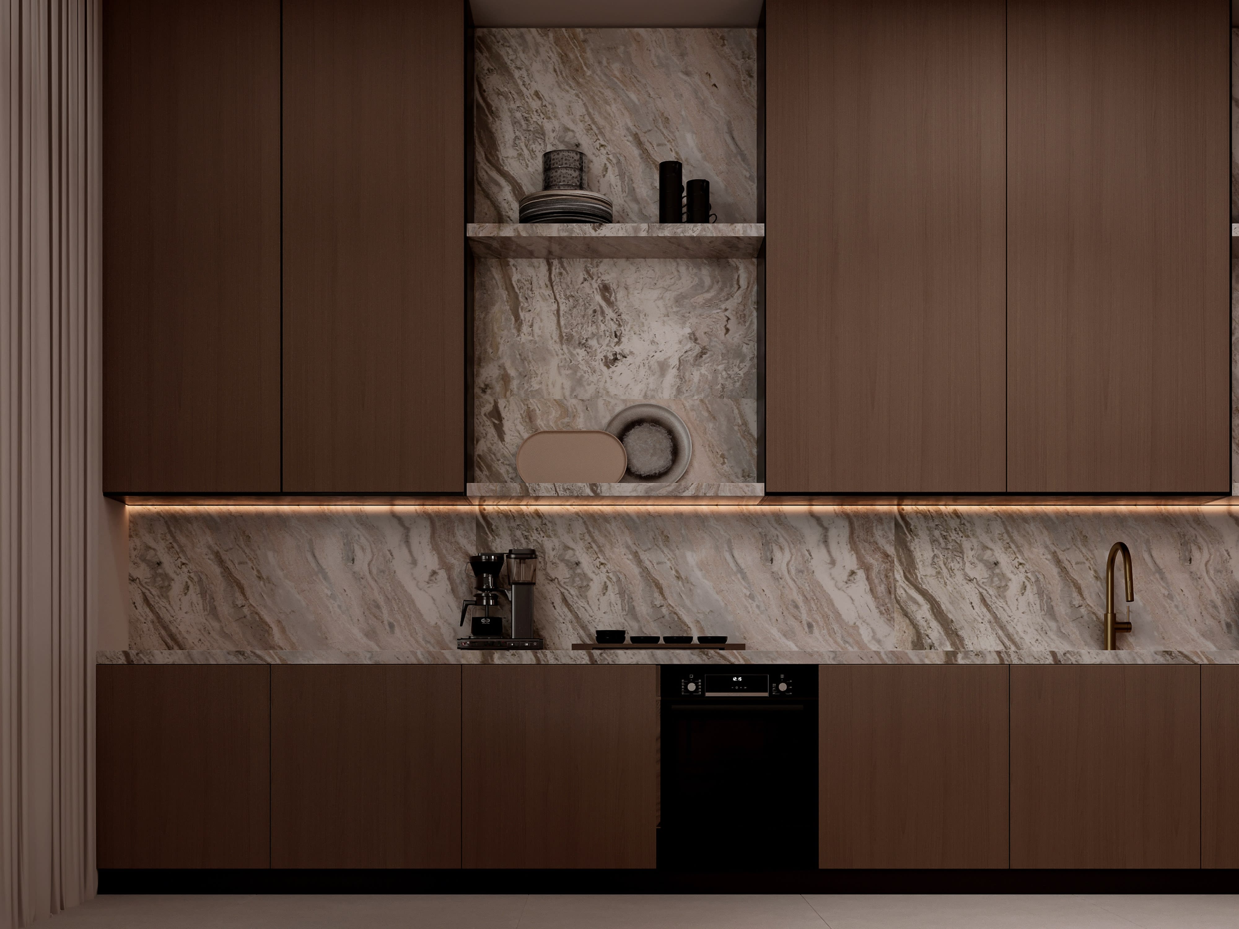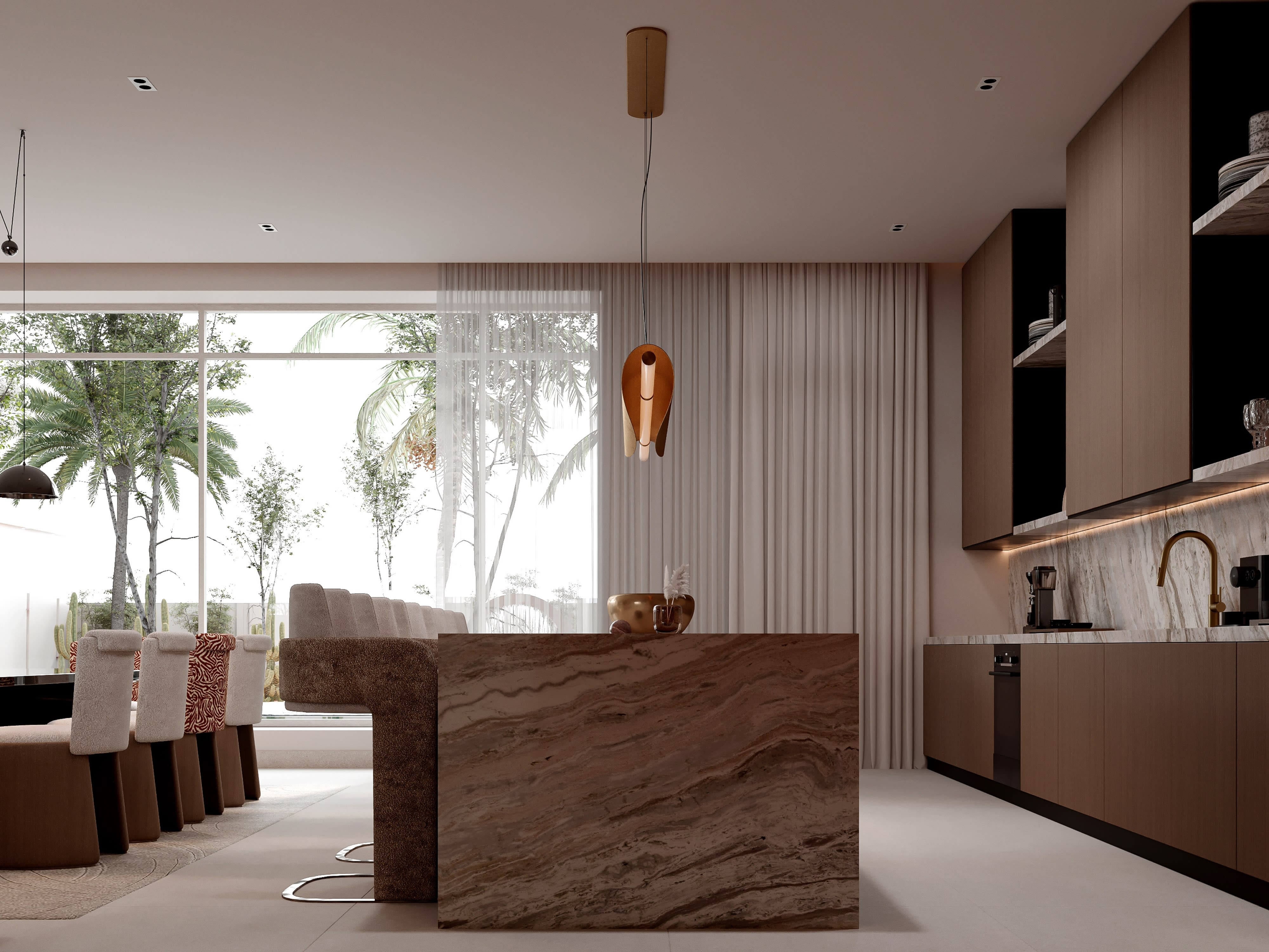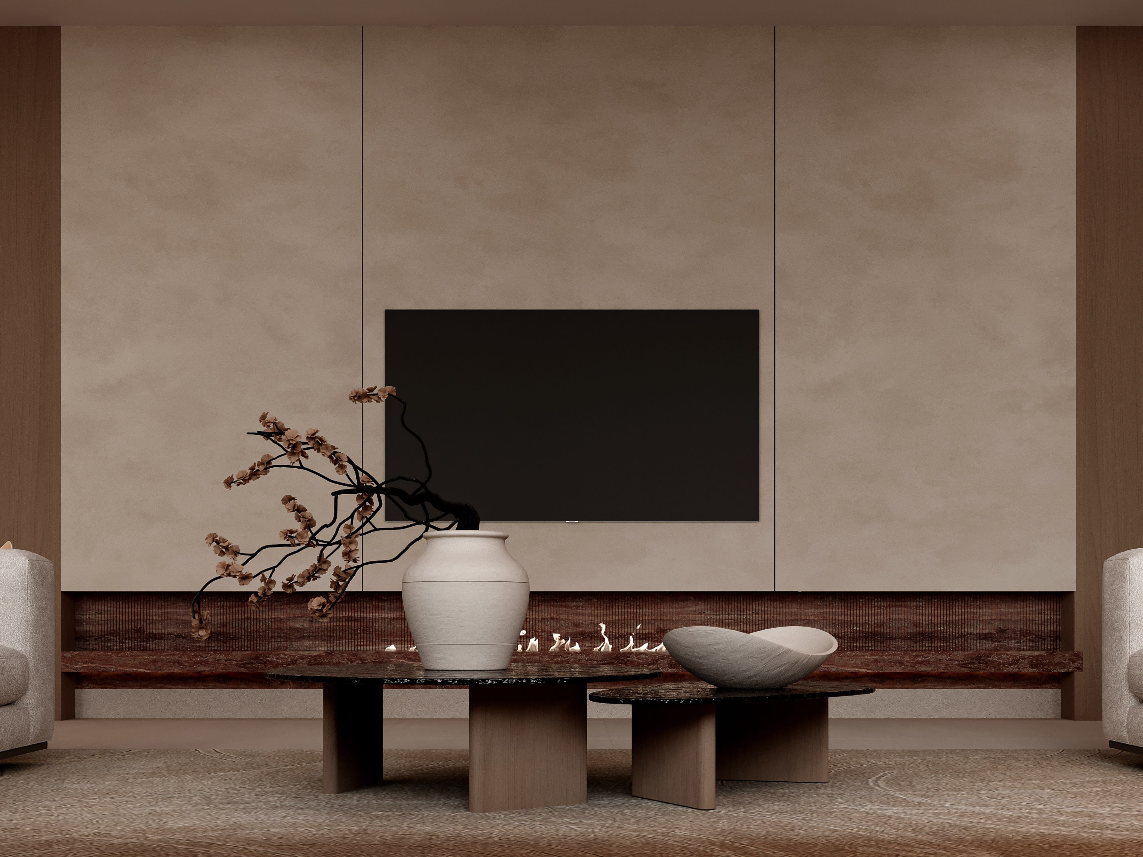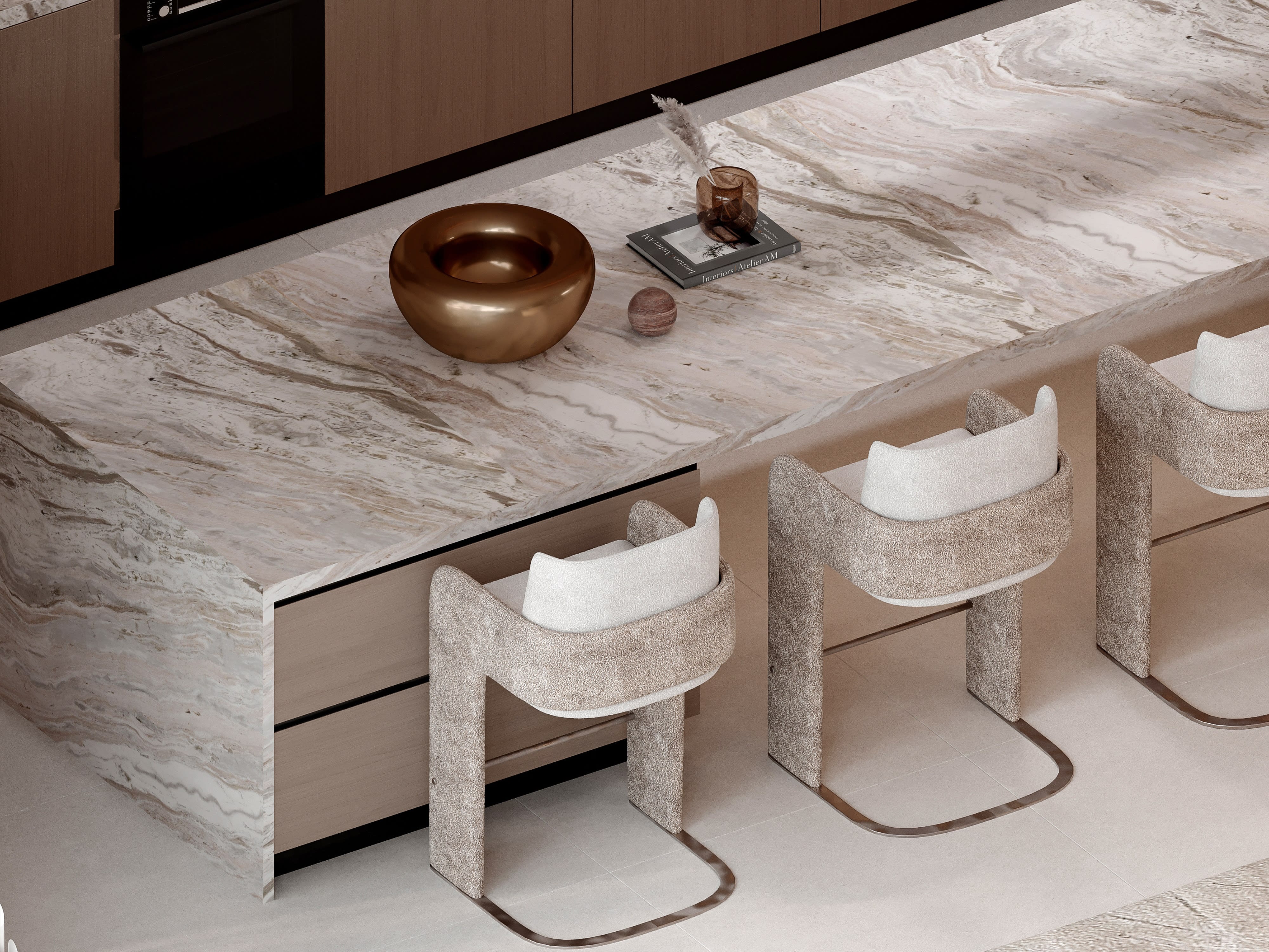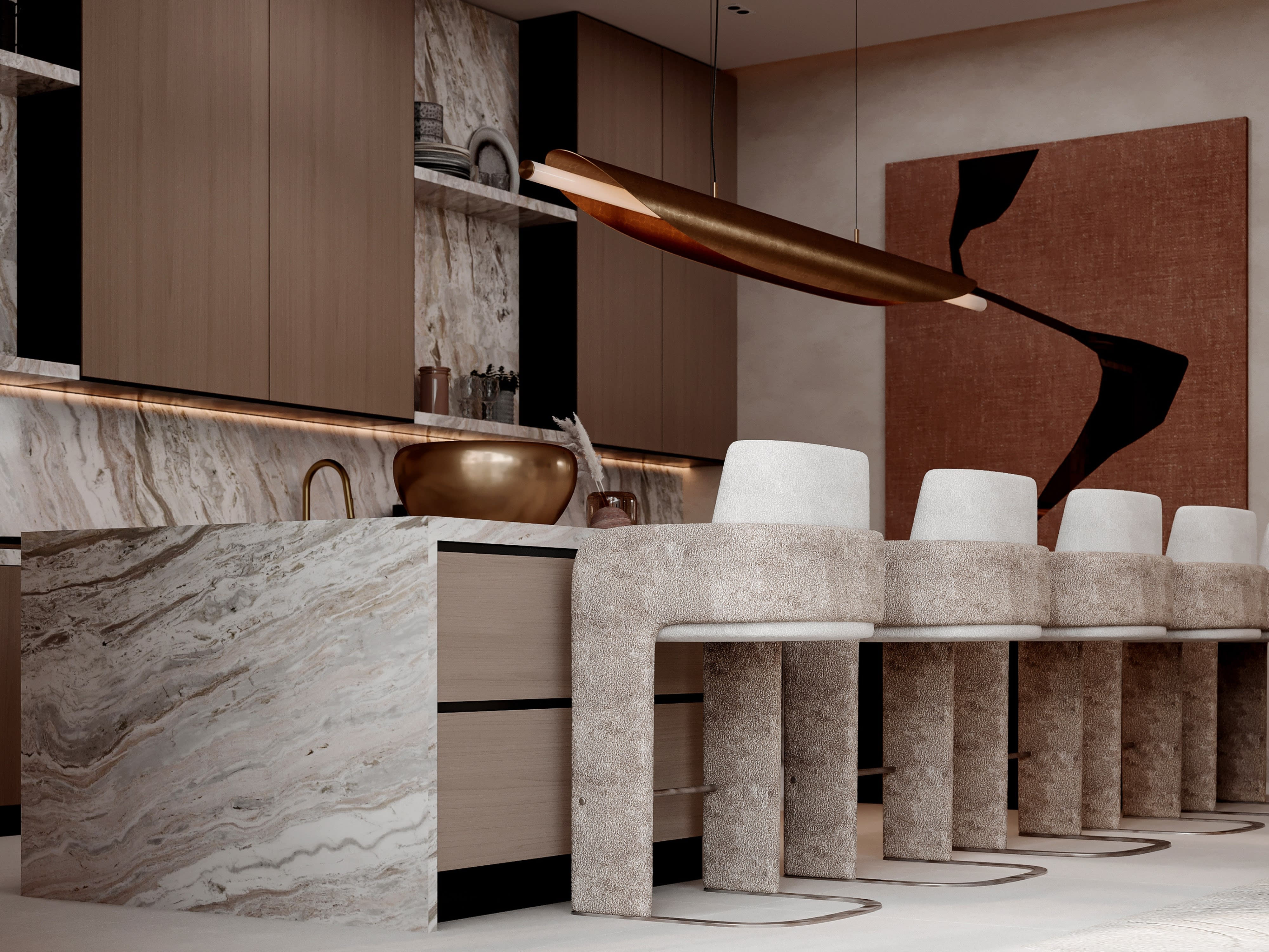 The material palette for Contemporary Sanctuary is deliberately restrained, focusing on natural materials with inherent beauty and exceptional quality. We began with a neutral base—walls in smooth plaster with a subtle warm white tone that catches and reflects light beautifully, creating surfaces that seem to glow. Floors throughout public spaces are honed Calacatta marble, its subtle gray veining providing visual interest while maintaining the overall sense of calm. This luxurious material extends even into the kitchen, creating continuity and elevating what's typically considered a service space to the same level of finish as living areas. In bedrooms, we switched to wide-plank white oak flooring with a matte natural oil finish—warmer underfoot and acoustically softer than stone. The kitchen is a study in precision and materiality: upper cabinets in back-painted glass create a reflective surface that makes the space feel larger, while lower cabinets are oak veneer to match bedroom floors. Countertops are book-matched Calacatta marble, creating dramatic visual impact while tying to floor material. All hardware is custom-designed in brushed brass, adding warm metallic accents that contrast beautifully with the cool stone. In bathrooms, we used large-format porcelain slabs that mimic natural stone but provide better water resistance and easier maintenance. The master bath features a freestanding soaking tub positioned to enjoy city views, with a walk-in shower enclosed in floor-to-ceiling glass. Throughout, we specified fixtures and fittings from premium European manufacturers, selected for both design excellence and lasting quality. Joinery details reveal our obsession with craft: perfectly mitered corners, shadow gaps instead of visible trim, push-to-open drawers with soft-close mechanisms, and LED lighting integrated into shelving. This attention to material quality and construction detail creates an interior that feels effortlessly luxurious—refined without being precious, minimal without being cold, contemporary without being trendy.