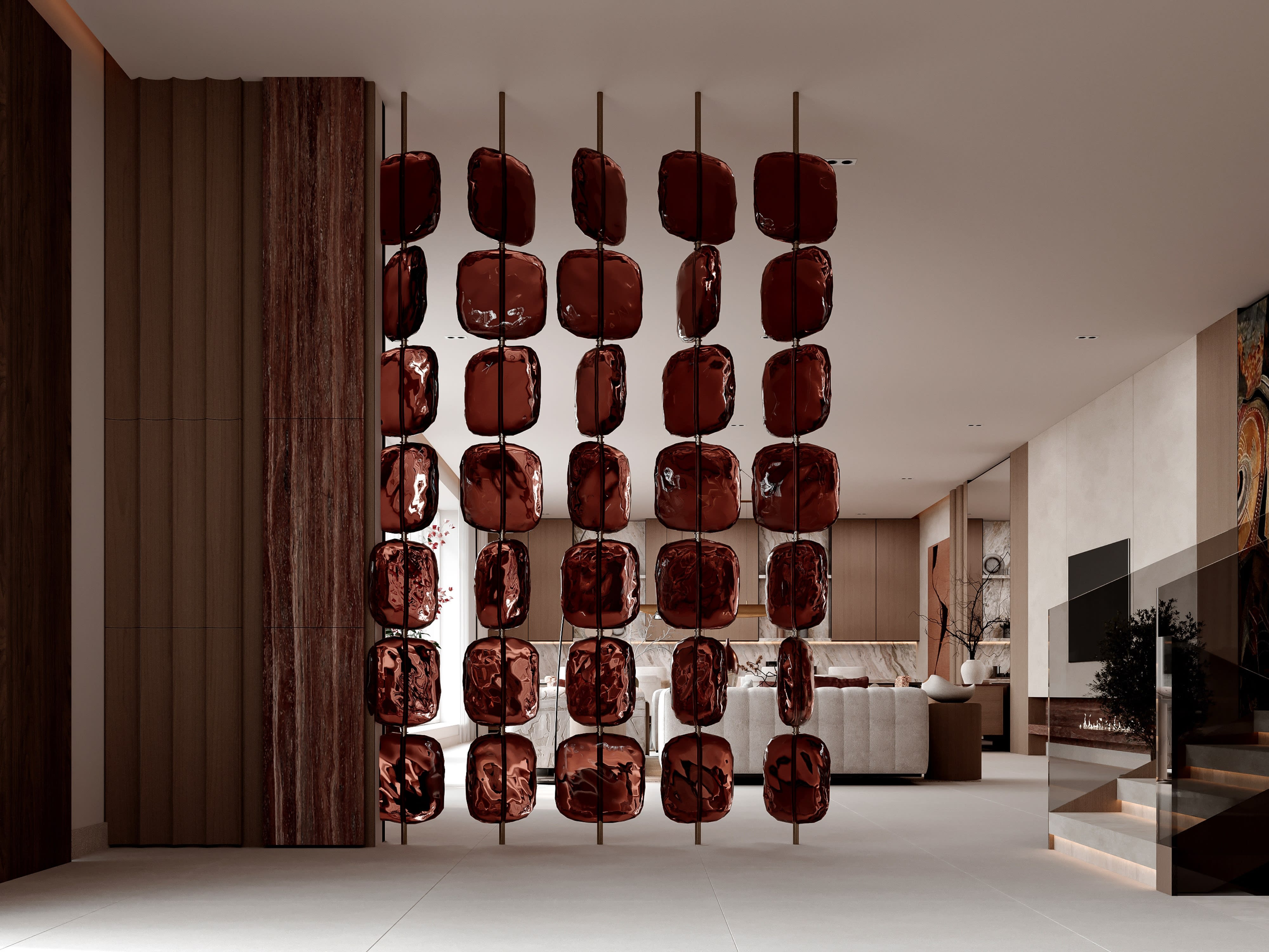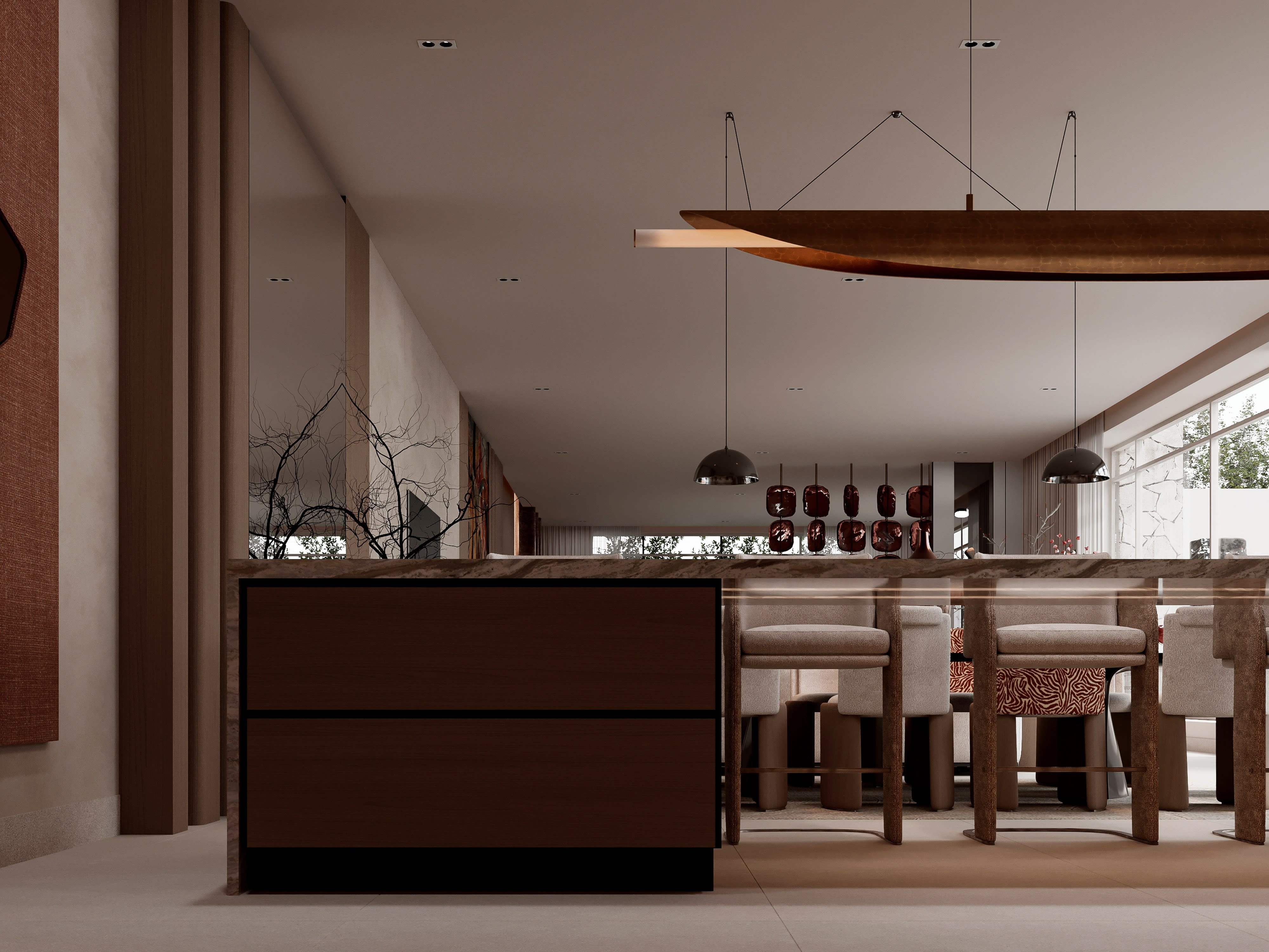 The original apartment layout was typical of its era—a series of closed rooms connected by corridors, with limited natural light penetration and no sense of spatial flow. Our first move was to reimagine the entire layout, removing all non-structural walls and creating an open plan that allows light to travel deep into the interior while maintaining necessary privacy for bedrooms and bathrooms. The new layout organizes space into three distinct zones: public spaces for living and entertaining near the windows, private sleeping quarters toward the interior, and service areas discreetly positioned for convenience without visual intrusion. These zones are defined not by walls but by subtle architectural gestures—a dropped ceiling over the dining area, a change in floor material, a freestanding joinery element that provides storage while allowing visual connection. The entry sequence establishes the design's refined character immediately: guests pass through a custom pivot door into a gallery-like hallway featuring a floating console and carefully curated art, then emerge into the main living space with its floor-to-ceiling windows and views across the city. The living area itself is deliberately uncluttered, with concealed storage throughout ensuring that personal items can be hidden away to maintain the serene aesthetic. A linear kitchen runs along one wall, its sleek cabinetry and integrated appliances creating a minimalist backdrop that doesn't compete with the living spaces. The master bedroom suite occupies a quiet corner of the apartment, with a sleeping area that opens to a luxurious bathroom through a walk-through closet. This layering of spaces—sleeping, dressing, bathing—creates a private retreat within the larger home. Guest bedrooms are smaller but equally refined, each with built-in storage and thoughtful detailing. Throughout, we eliminated all unnecessary elements, focusing on clean lines, perfect proportions, and exquisite materials that create richness through quality rather than quantity.